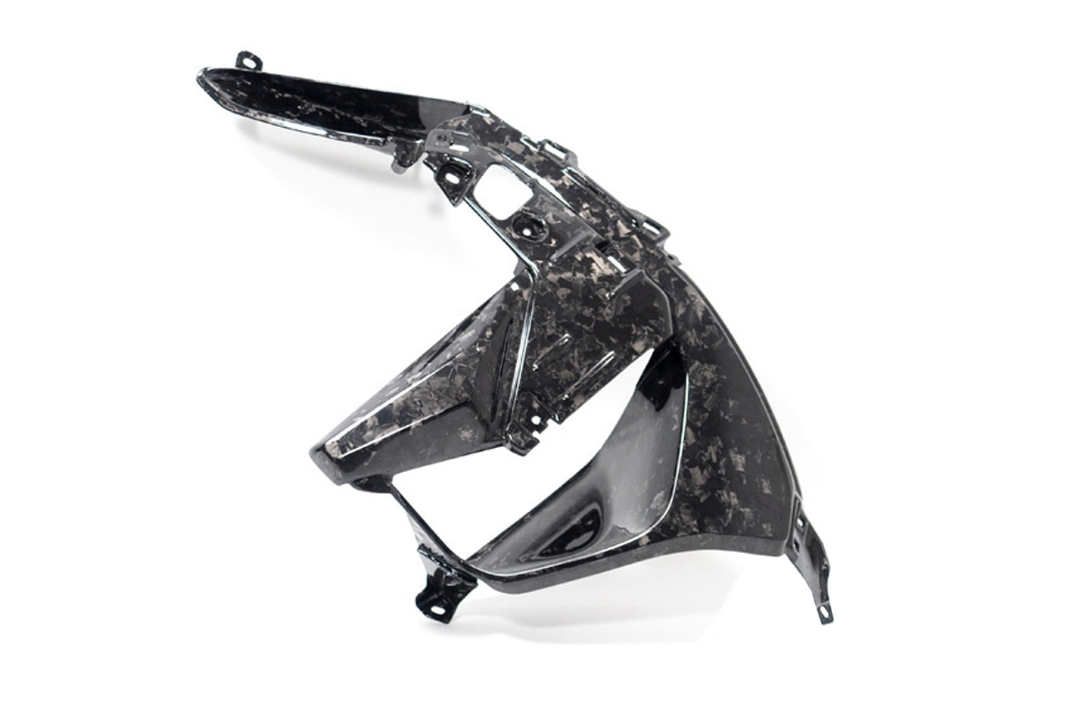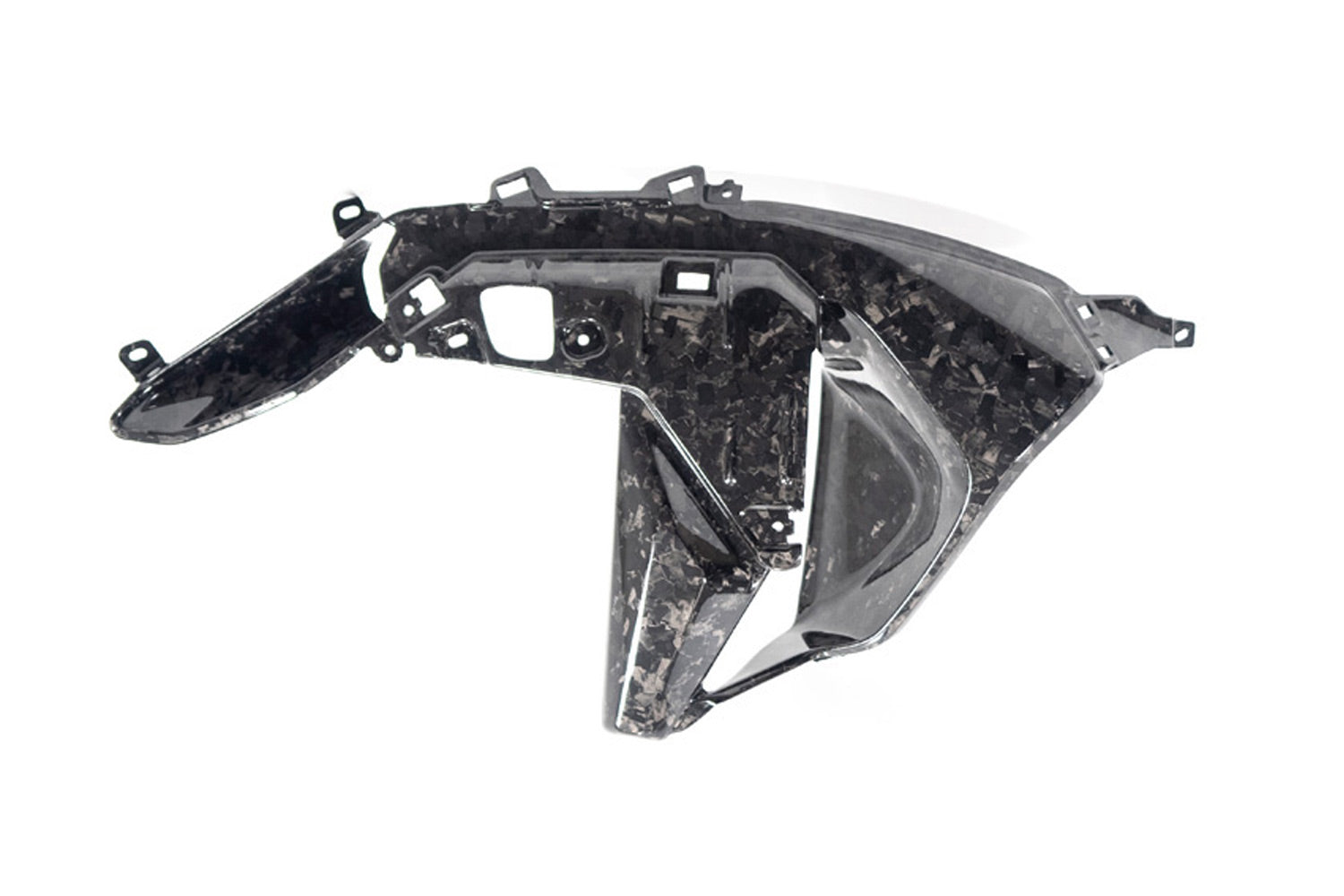 The innovative BDC material is used here, giving the component a completely new and individual touch. The surface of the BDC part is a unique piece reminiscent of marble. The BDC is also hand-laminated at Ilmberger and cured in multiple stages in an autoclave. The material impresses not only with its exciting appearance but also with its technical properties. The different fibres disperse the incoming light, creating an unprecedented reflection. The final clear coat layer is in a timeless glossy finish, highlighting the component's luxurious and sporty look.