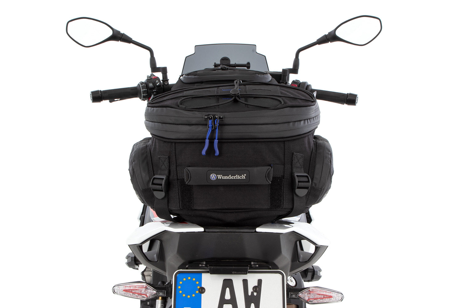 It has a volume of 14 litres that can be extended to 20 litres if needed. There are two additional practical bags on the side. The base of the bag is dimensionally stable. It closes with a water-repelling, dust-proof zip. The bag thus offers secure hold and protection for your luggage and doesn’t flutter at high speeds. This means it doesn’t make any sounds caused by high speeds.
