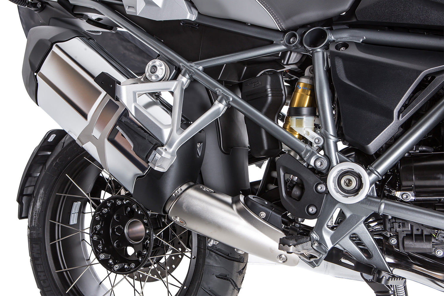 The area of the swingarm bearing, swingarm, collector, gearbox, and shock absorber are located in front of the rear wheel. They are therefore exposed to dirt, stone chips, and water thrown up by the rear wheel. Apart from the dirt that accumulates, this puts significant strain on the technical components.