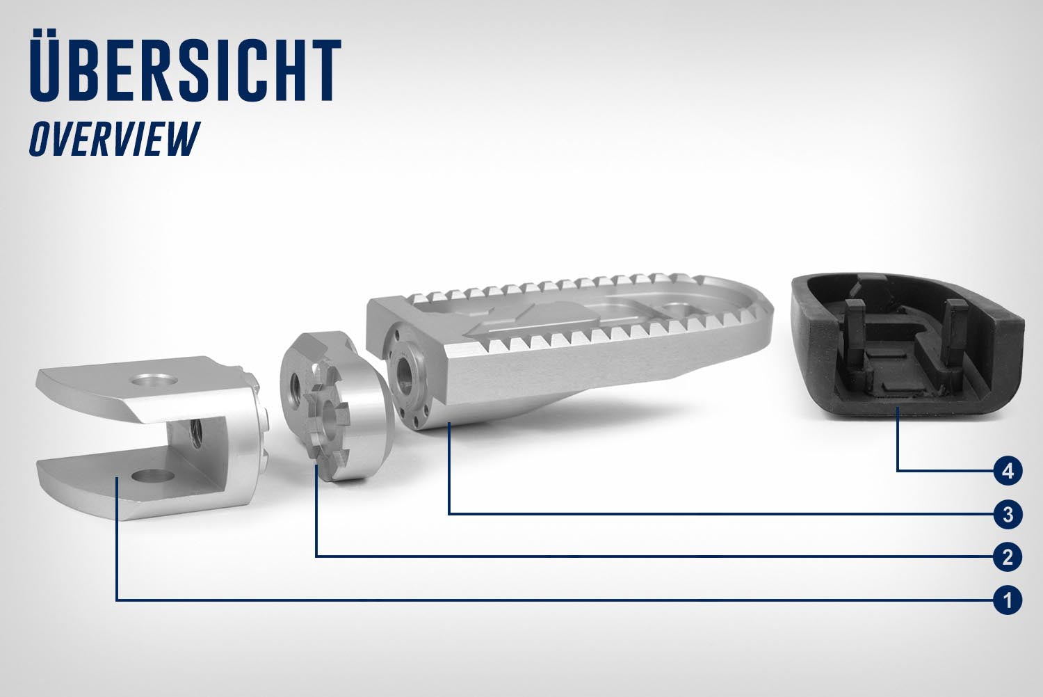 Our Vario rest system is the ultimate solution when it comes to adjustable footrests. With an adjustment range of 100 mm diameter, it leaves nothing to be desired. No matter whether you've got big feet or small ones, whether you want to increase the lean angle freedom or just comfortably relieve the knee angle. The eightfold adjustment option of a full 360° ensures enormous flexibility. This win for comfort is available for rider and passenger. For sporty riders, we also offer the rests in a bevelled design. The delivery always comes with German Type approval. All parts are made from high-solidity aluminium and anodises in silver or black.