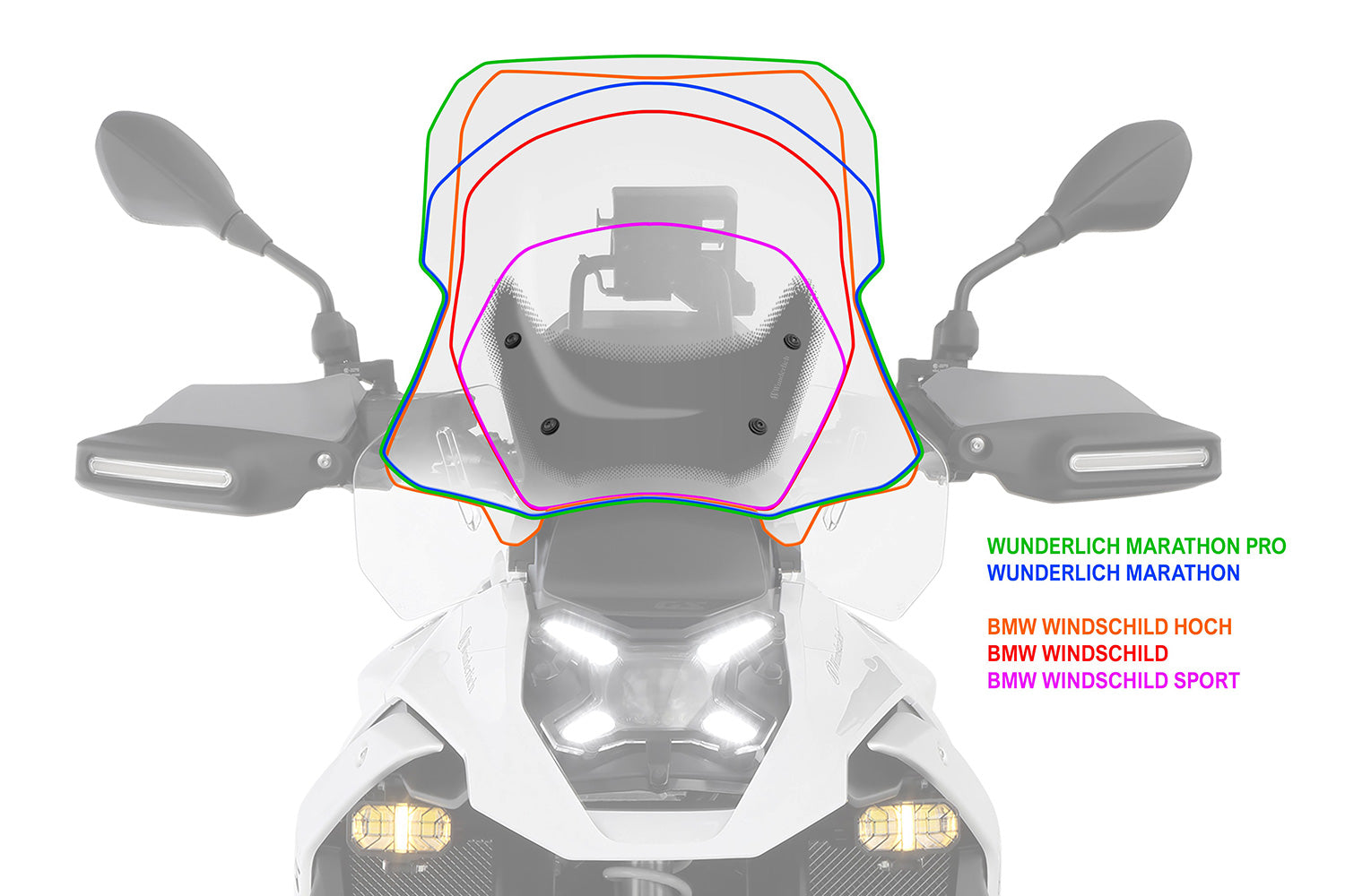 R1300 GS - does not fit with 13320-000, lower mounting position not compatible with headlight guard | R1300 GS Adventure - does not fit with 13320-000, lower mounting position not compatible with headlight guardMARATHON PRO for the BMW R 1300 GS and GS Adventure stands for outstanding long-distance comfort, maximum protection, relief, reduced turbulence, personalised adjustability, and an integrated, aerodynamically effective backflow – with ACC